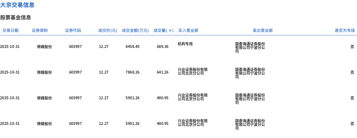 10月31日,继峰股份大宗交易成交2292.52万股,成交额2.81亿元,占当日总成交额的33.37%,成交价12.27元,较市场收盘价13.87元折价11.54%。